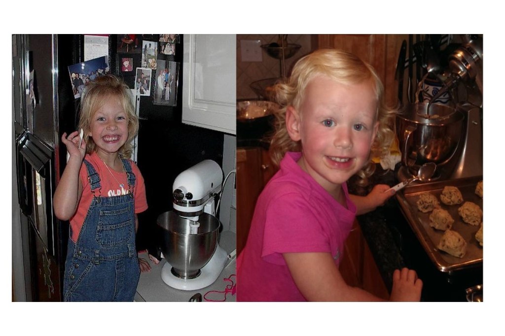 Picture of my younger cousin, Emma (4 yrs) helping my dad make the same cookie dough 13 years later, (right).